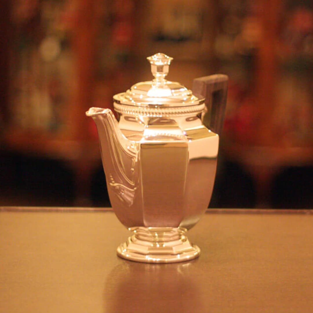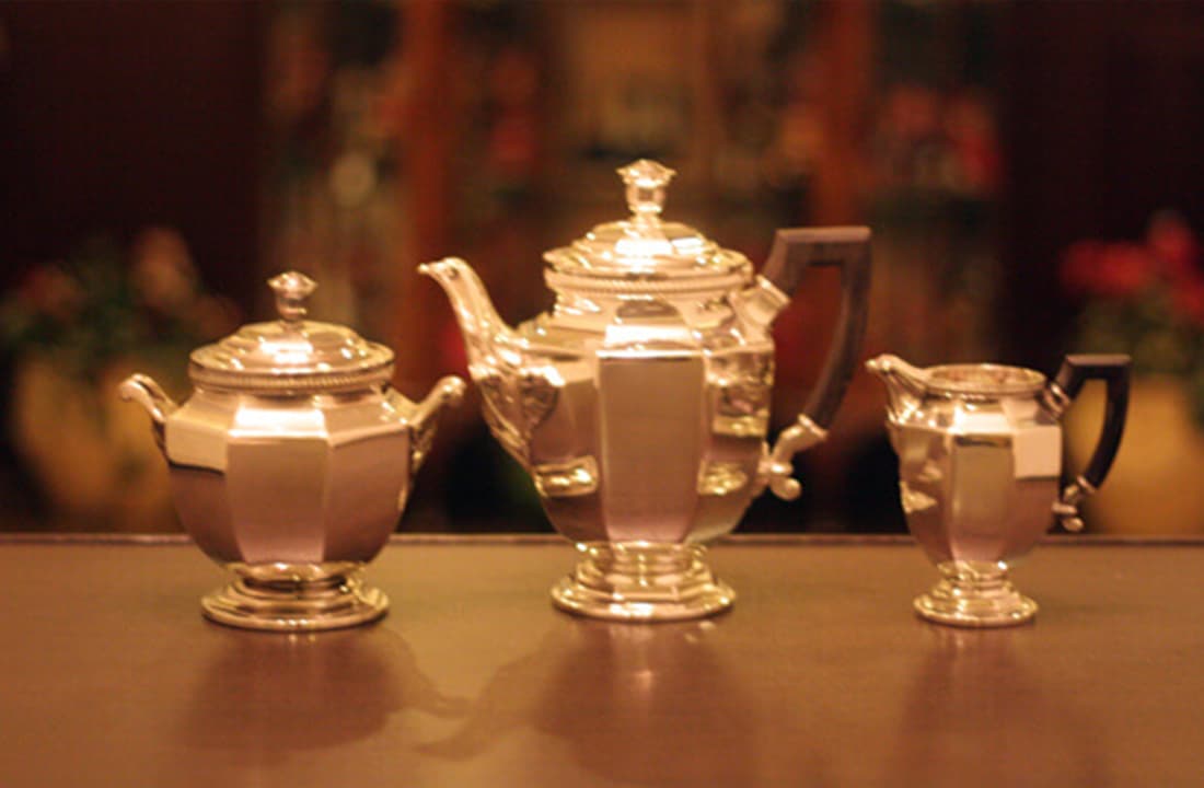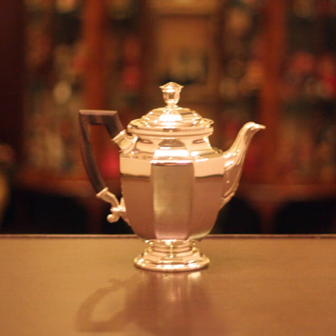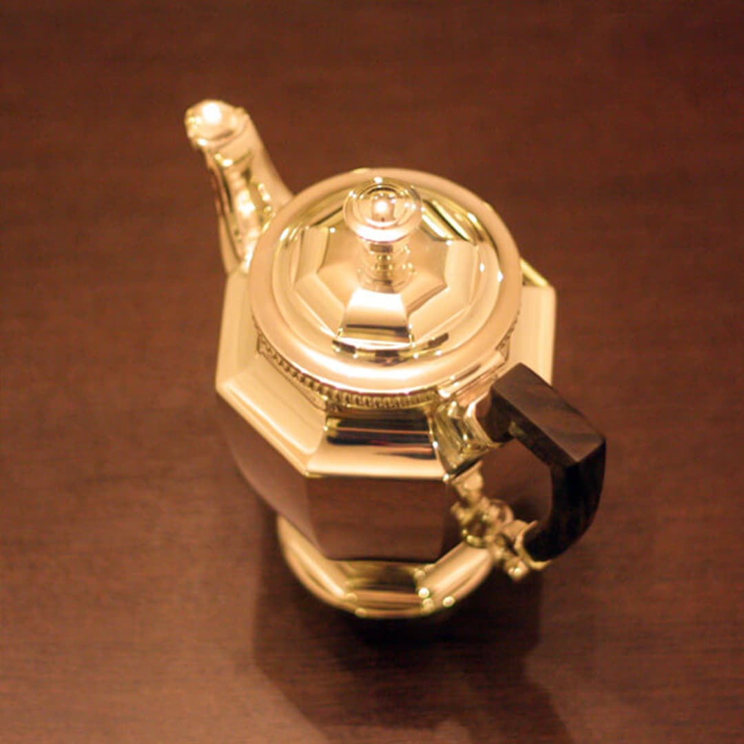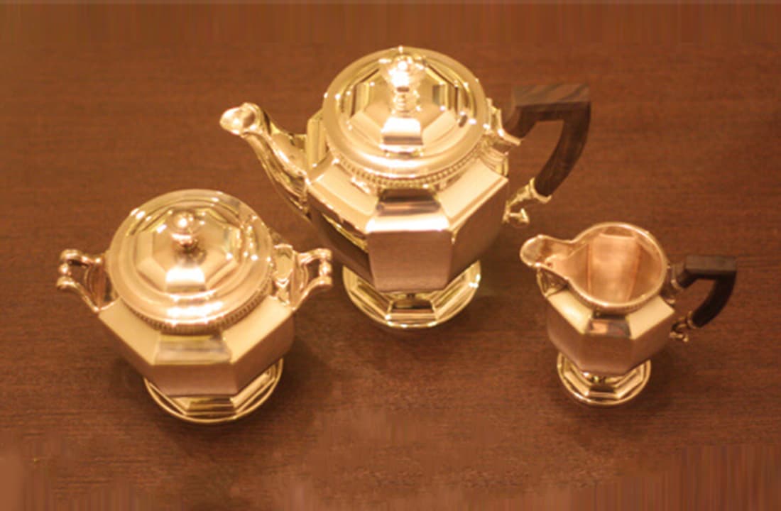 家庭用2人用(ティーカップ4杯)の2点ティーセットです。イギリスで改装(再メッキ)されたものです。