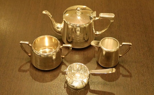 本商品はロンドンティールーム設立よりマッピン&ウェッブ社との契約で、日本で初めて導入したシルバープレートティーセットです。ロンドン市紋章をシンボルとした逸品です。