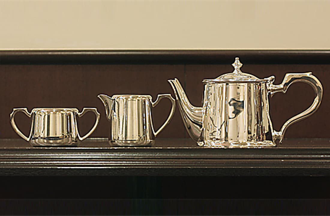 家庭用仕様で1人用(ティーカップ2~3杯)3点ティーセット。綺麗に改装(再メッキ)されています。