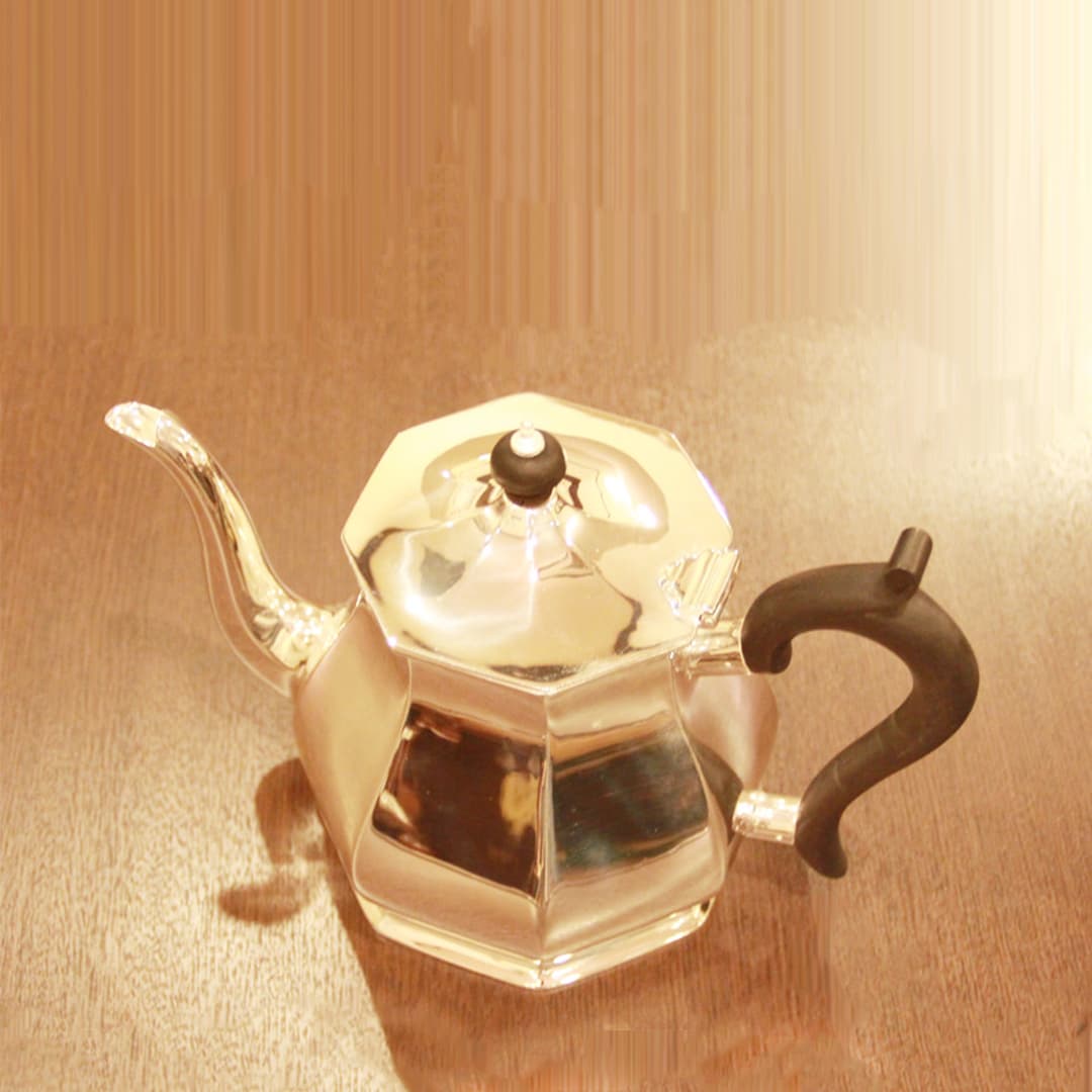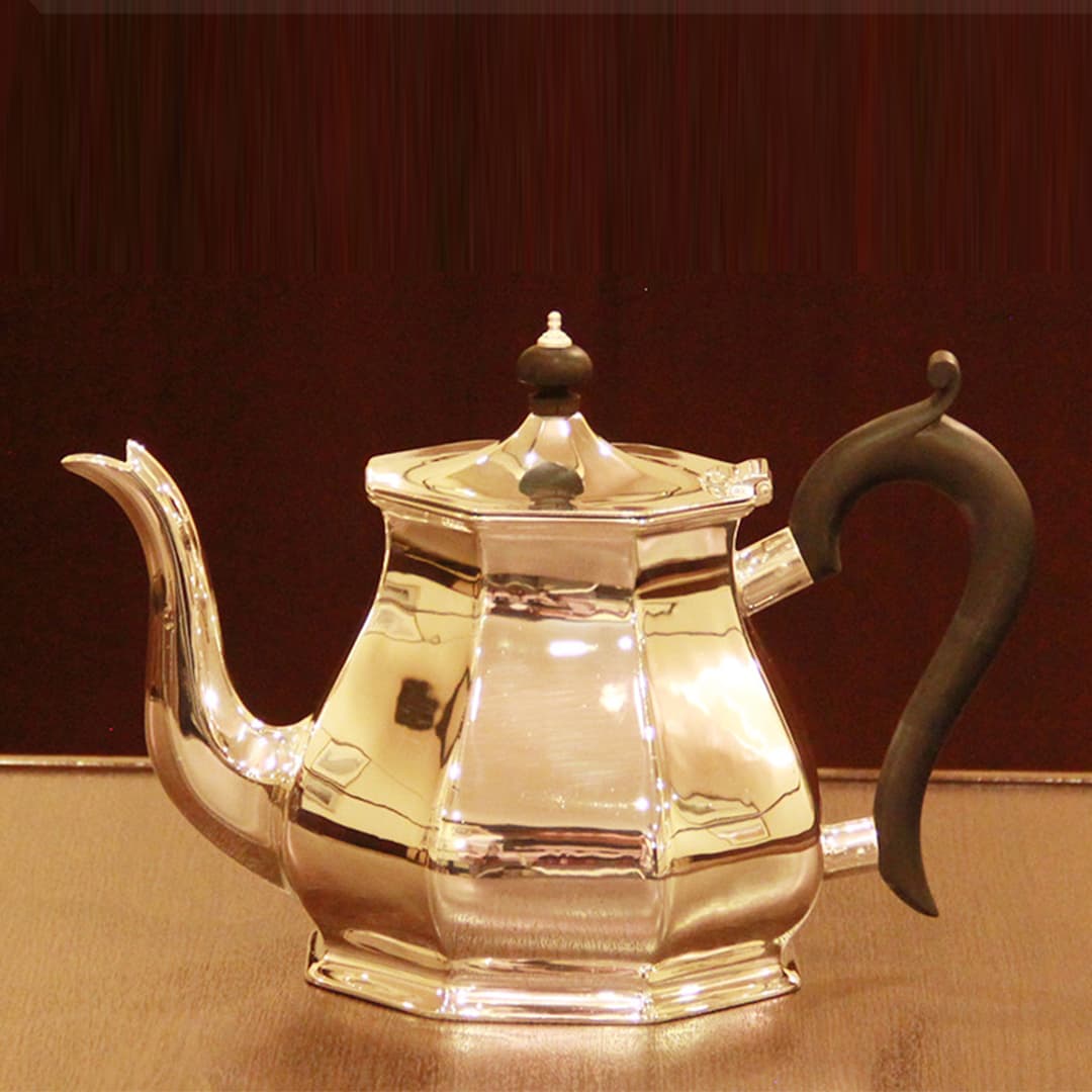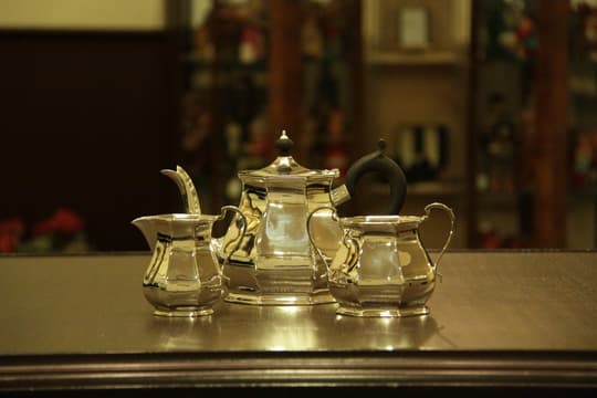 家庭用仕様で2人用(ティーカップ5杯)3点セットきれいに改装(再メッキ)されたものです。