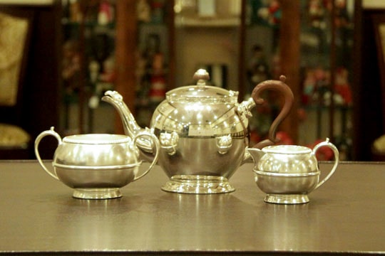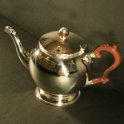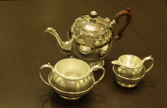 家庭用2人用(ティーカップ4杯)の3点ティーセットです。イギリスで改装(再メッキ)されたものです。