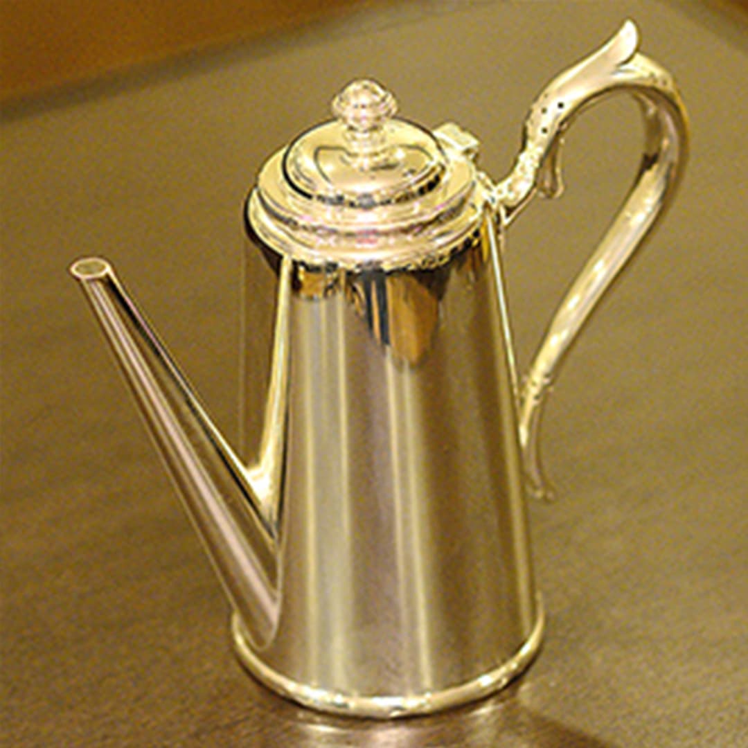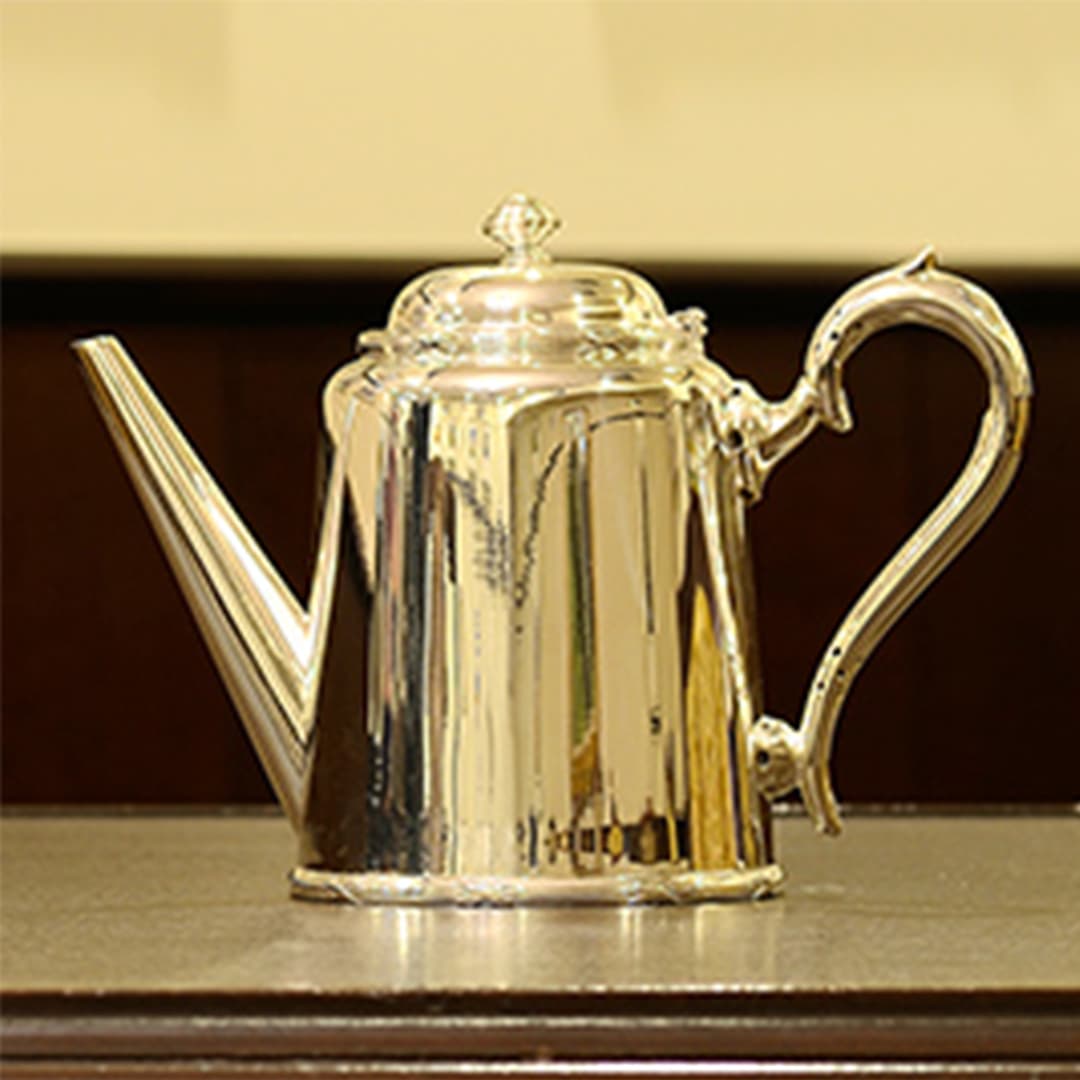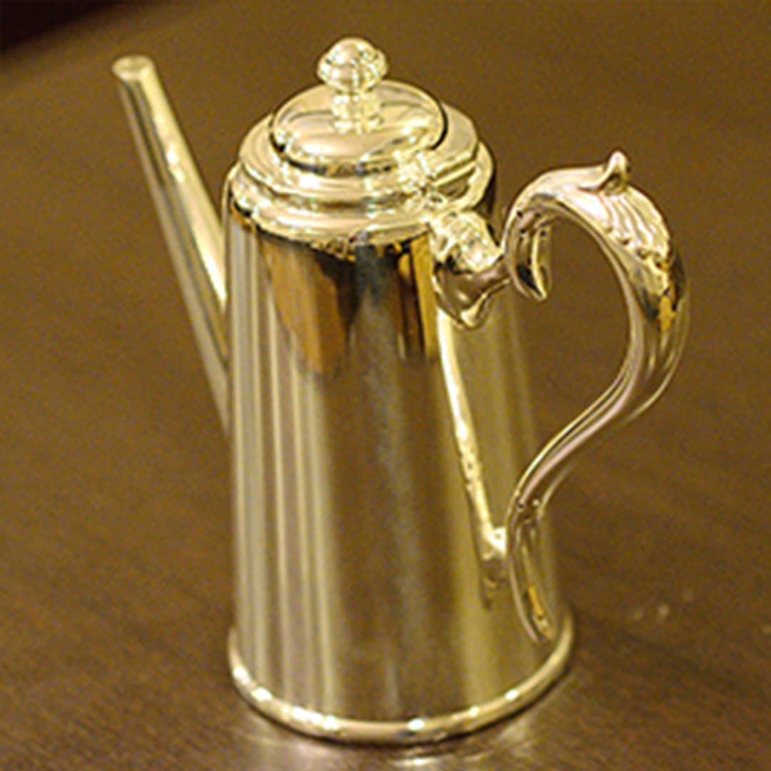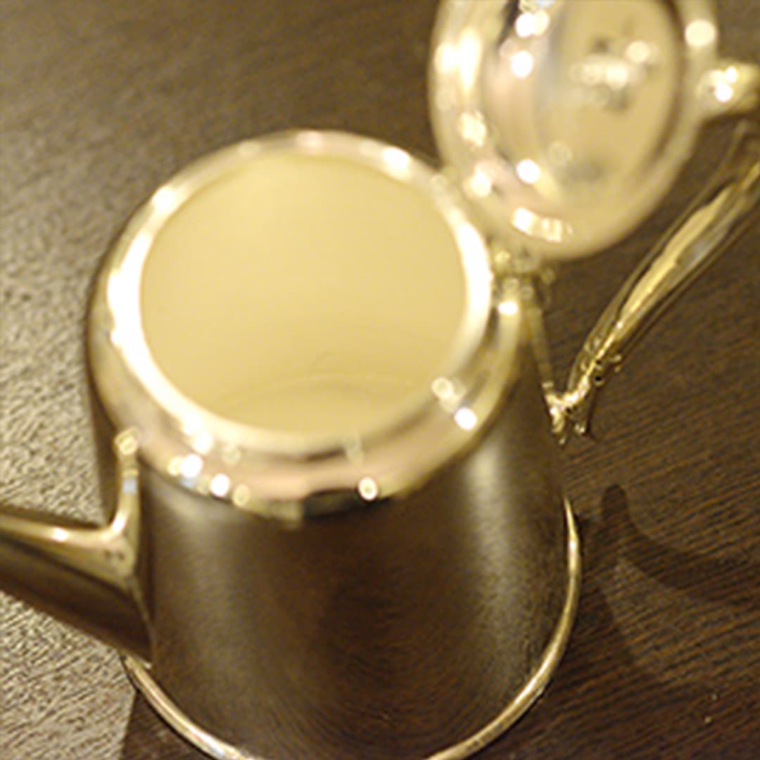 Walker & Hall(ウォーカー&ホール)製のティーセットです。1900~1940年代製(推定)。家庭仕様の2人用(ティーカップ5杯分)、4点ティーセットです。日本で改装(再メッキ)されたものです。
