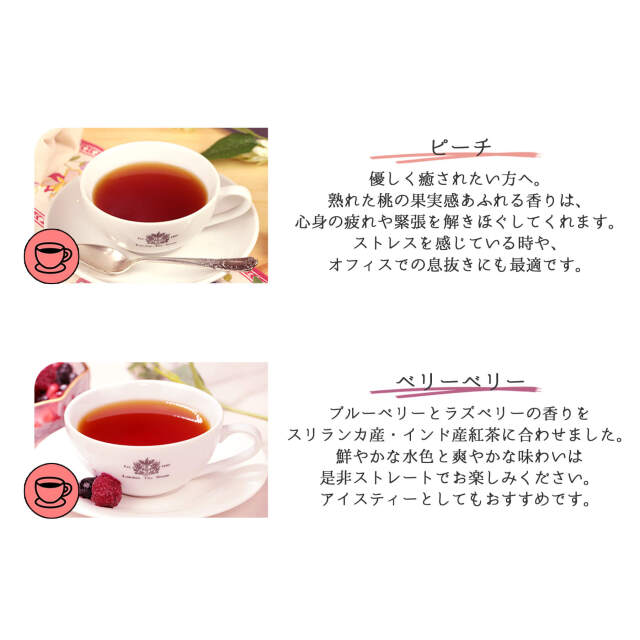 ブルーベリーとラズベリーの香りを スリランカ産・インド産紅茶に合わせました。 鮮やかな水色と爽やかな味わいは 是非ストレートでお楽しみください。 アイスティーとしてもおすすめです。