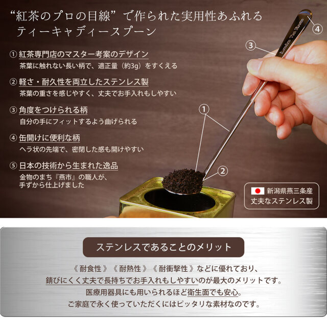 長い柄と、スプーンの頭部分の角度のおかげで、底の深い茶筒タイプの缶から茶葉をすくうのも楽々。