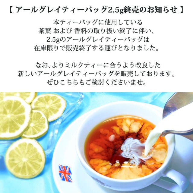 なお、よりミルクティーにも 合うようブレンドした、 新しいアールグレイティーバッグ の販売も開始しております。 新アールグレイティーバッグは こちらから ぜひご検討くださいませ。